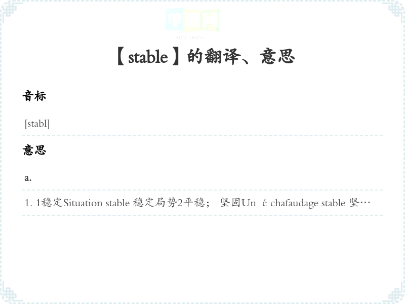 【stable】 助:、 词根:、 近义词:、 反义词: 联想词