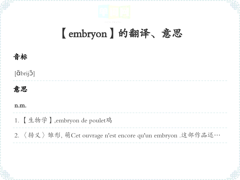 〈转义〉雏形, 萌Cet ouvrage n'est encore qu'un embryon .这部作品还只是个雏形。à l'état d'embryon 在萌, 在酝酿中