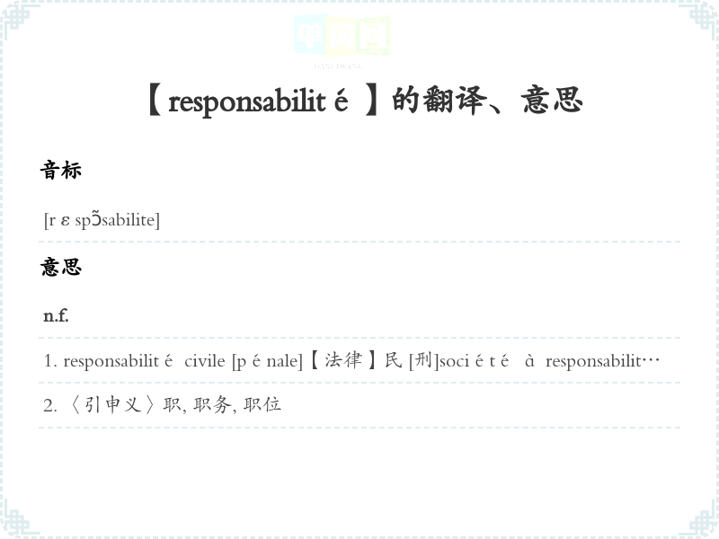 responsabilité civile [pénale]【法律】民 [刑]société à responsabilité limitée有限()公司 [缩写为S. A. R. L.]accepter une responsabilité 承一prendre la responsabilité d'une affaire起一的avoir la responsabilité de对…有faire qch. sous sa (propre) responsabilité 自己做某