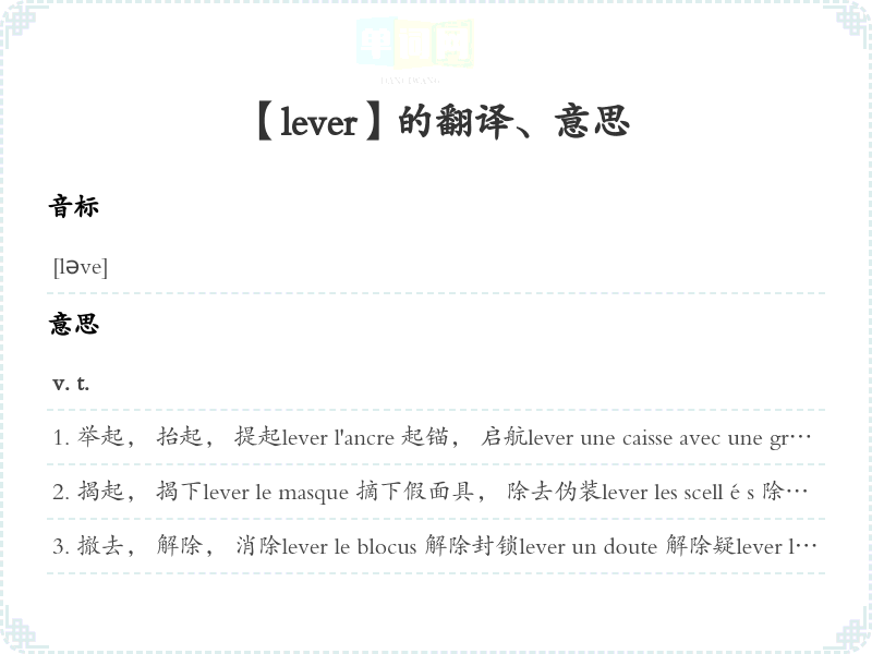 撤去, 解除, 消除lever le blocus 解除封锁lever un doute 解除疑lever le camp 拔营; [转]离开, 逃跑lever une interdiction 取消禁令lever les obstacles 排除障碍lever la séance 宣布散会lever la sentinelle 撤除哨兵lever le siège 撤围; [转, ]走开, 离去