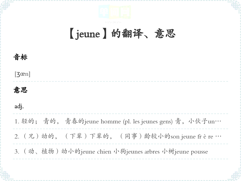 轻的; 青的, 青春的jeune homme (pl. les jeunes gens) 青,小伙子un homme jeune (相对地)轻还轻jeune personne 轻女子mourire jeune 夭折