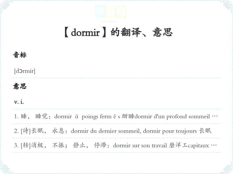 睡, 睡觉:dormir à poings fermés 酣睡dormir d'un profond sommeil 睡得很熟ne dormir que d'un œil 睡觉时保持警惕dormir debout 倦极思睡dormir très tard 很晚睡觉dormir sur les deux oreilles 高枕无忧Vous pouvez dormir tranquille. 你放心好了。 (用v. t. ) Dormez votre sommeil. 睡你的大觉吧。