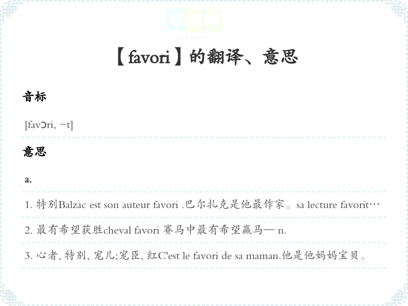 【favori】 名词变化:、 动词变化:、 形容词变化:、 副词变化:、 近义词:、 反义词: 联想词