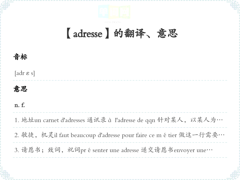 地址un carnet d'adresses 通讯录à l'adresse de qqn 针对某人,以某人为目标Je vais noter ton adresse 我要记下你的地址Adresse électronique 电子邮件地址