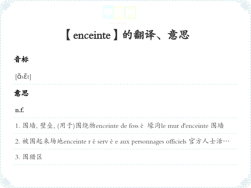 enceinte acoustique 扬声器组, 喇叭箱a.f.怀孕 [指人]femmes enceintes 孕妇Elle est enceinte de trois mois. 她怀孕三个月了。