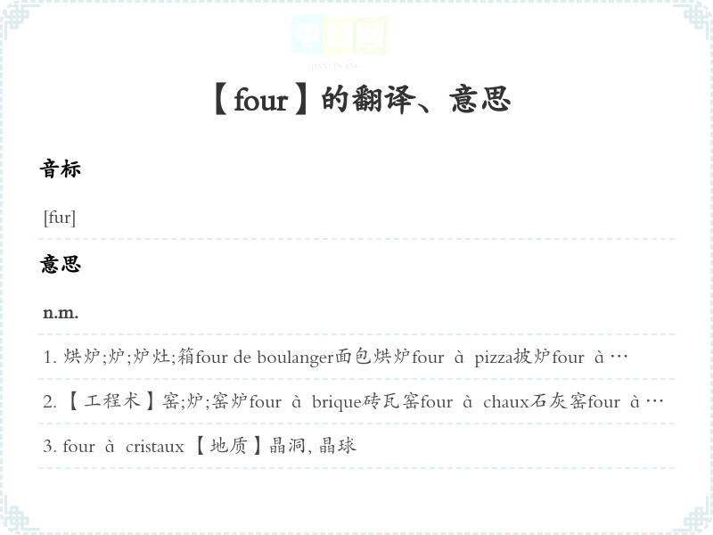 烘炉;炉;炉灶;箱four de boulanger面包烘炉four à pizza披炉four à micro-ondes炉four muni d'un tournebroche有转动铁扦的炉four à gaz煤气灶four électrique电炉four à pyrolyse自洁式炉bouche [gueule] d'un four 炉口, 灶口mettre un gâteau au four 把蛋糕放入炉ouvrir la bouche comme un four , 〈引申义〉 ouvrir un grand four 张开大口On ne peut être à la fois au four et au moulin.〈谚语〉一个人不能同时做两件事。一个人不能同时在两处地方。faire un four 〈转义〉失败, 受挫, 不成功 [多指演出或作品]La représentation a été un four complet [noir].〈引申义〉演出完全失败了。pièce de four 糕点petits fours小蛋糕, 花式糕点rôti cuit au four 在烘炉里的肉