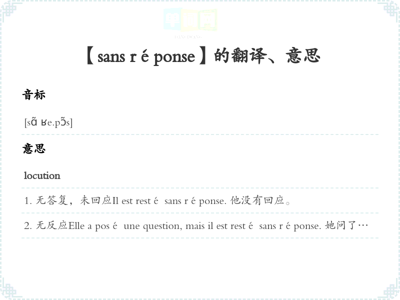 无反应Elle a posé une question, mais il est resté sans réponse. 她问了一个问题,但他没有回答。