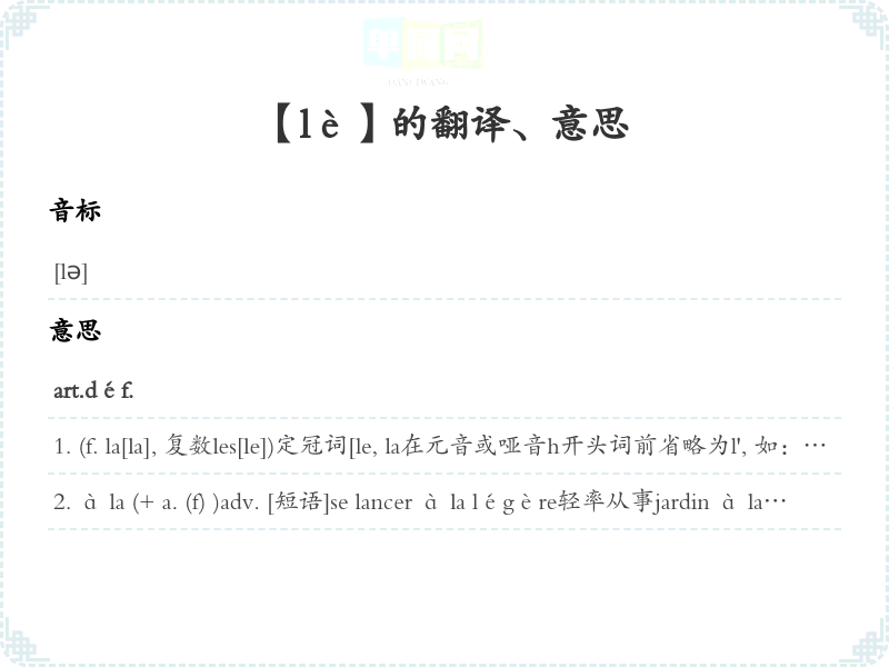 (f. la[la], 复数les[le])定冠词[le, la在元音或哑音h开头词前省略为l', 如:l'ami, l'épée, l'habit, 但在onze, onzième等前不能省略, 如:le onze octobre, le onzième siècle; 介词de, à与le, les连用时, 分别构成结合冠词du, des, au, aux; 介词en与les在古法语中结合成ès, 现代仍有个别词组沿用此结合形式, 如:docteur ès lettres(文学博士)]A[用在名词前]1[用在表概念名词前]Le chien est un mammifère carnivore. 狗是食肉哺乳动物。2[在姓氏前用les表家族]les Bourbons波旁家族les Goncourt龚古兄弟3[用在表唯一, 众所周知, 用作典型, 对方明确或上文提到过事物名词前]le soleil太阳la lune月亮avoir la fièvre发烧garder la chambre(因病)不出门Fermezla porte. 请关门。4[和表人某一部分名词或与间接宾语人称代词一起使用, 起主有限定词作用]baisser les yeux垂下眼睛Il s'est cassé la jambe. 他摔断了腿。5[用在有补语或从句限定名词前]le livre de mon ami我朋友书l'espoir de réussir成功希望C'est l'homme dont je vous ai parlé. 这就是我对您起过那个人。6[用在有 a. 修饰地名前]le vieux Paris老巴黎7[起指或感叹限定词作用]Oh!Le beau papillon!啊, 这只美丽蝴蝶!8[用在表度量或时间名词前, 起泛指限定词chaque作用]cent francs la pièce100法郎一个Le médecin reçoit le lundi[les lundis]. 医生每星期一接待病人。9[与某些介词连用, 放在数词前面]sur les deux heures两点钟左右vers les huit heures将近八点钟Cela coûte dans les cinquante francs. 这个价钱在50法郎左右。10[用在人名 n. 前, 表蔑视或强调]la Thénardier戴纳迪埃老婆la Pompadour蓬巴杜夫人11[用在地名 n. 前面]le Rhin莱茵河l'Himalaya喜马拉雅山la France法国12[用在作普通名词用 n. 前]la Citroën de Paul雪铁龙牌汽车les Rembrandt de ce musée这个博物馆伦勃朗画B1[在作名词用其他词类前]les Misérables《悲惨世界》le manger et le boire吃和喝; 吃和喝le pourquoi et le comment原因与方式l'important, c'est. . . 重要在于…