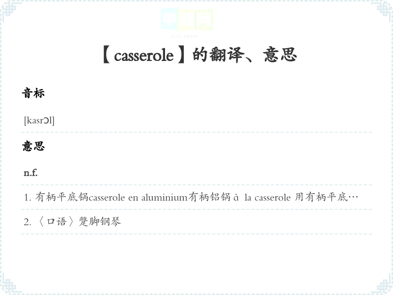 有柄平底锅casserole en aluminium有柄铝锅à la casserole 用有柄平底锅烧的 [指菜肴]passer à la casserole 〈转义〉〈口语〉杀死;受煎熬, 处境恶劣;(妇)发生性关系traîner une casserole 〈口语〉受一事牵连;背着黑锅