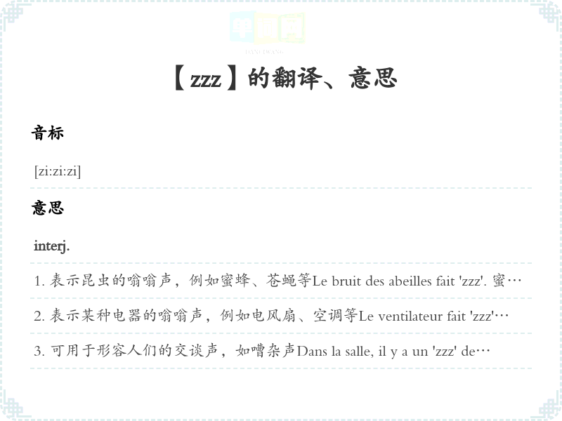 表示昆虫的嗡嗡声,例如蜜蜂、苍蝇等Le bruit des abeilles fait 'zzz'. 蜜蜂的声音是'嗡'。