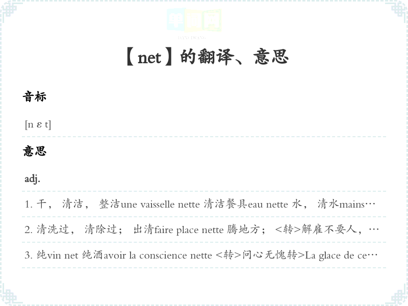 干, 清洁, 整洁une vaisselle nette 清洁餐具eau nette 水, 清水mains nettes 干手avoir les mains nettes <转>清白廉洁, 手脚干转>intérieur net et propre 屋子里整洁干