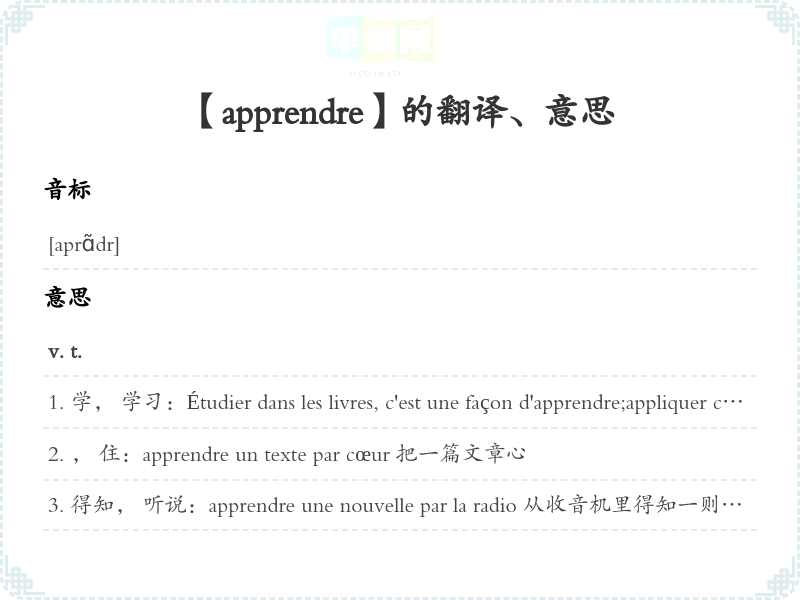 【apprendre】 助:、 派生:、 联想:、 用法:、 近义词:、 反义词: 联想词