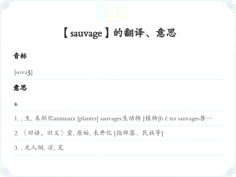【sauvage】 联想:、 近义词:、 反义词: 联想词