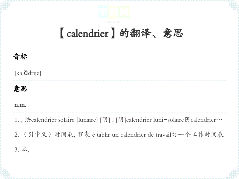 , 法calendrier solaire [lunaire] [阴] , [阴]calendrier luni-solaire阴calendrier chinois中国(旧), 夏, 农calendrier musulman伊斯兰教, 回calendrier romain [julien, grégorien]罗马 [儒略, 格里]calendrier républicain法兰西共和