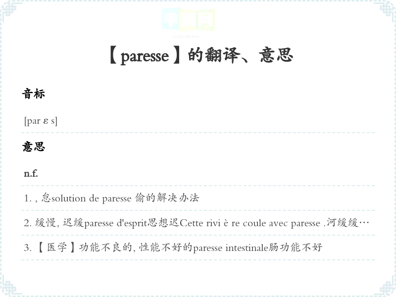 【paresse】 联想、 名词变化:、 动词变化:、 形容词变化:、 副词变化:、 义词、 反义词、 同音、音词 联想词