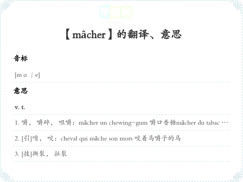 嚼, 嚼碎, 咀嚼:mâcher un chewing-gum 嚼口香糖mâcher du tabac 嚼烟叶mâcher le travail (la besogne) à qn [转]为某人做准备工作ne pas mâcher ses mots (son opinion) [转]直言不讳, 直截了当地表示自己的意见mâcher sa leçon à un enfant [转]给孩子句反复讲解课文papier mâché 混凝纸浆