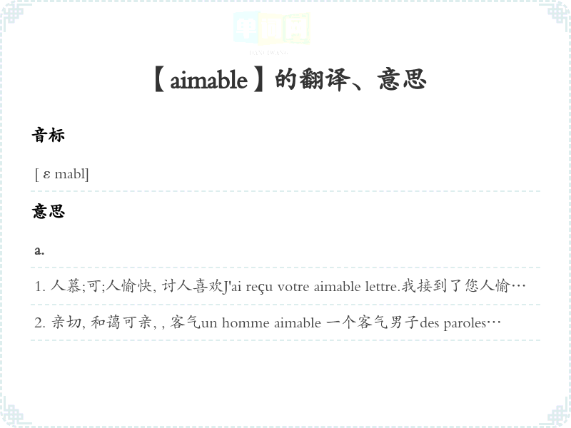 人慕;可;人愉快, 讨人喜欢J'ai reçu votre aimable lettre.我接到了您人愉快来信。