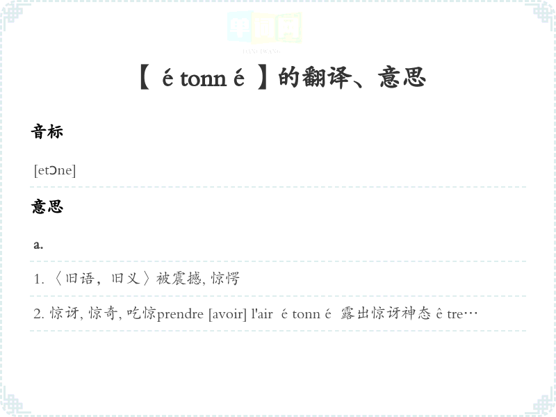惊讶, 惊奇, 吃惊prendre [avoir] l'air étonné 露出惊讶神态être étonné de (+inf.)为某事而感到惊讶[用作n.]faire l'étonné 装出惊讶样子