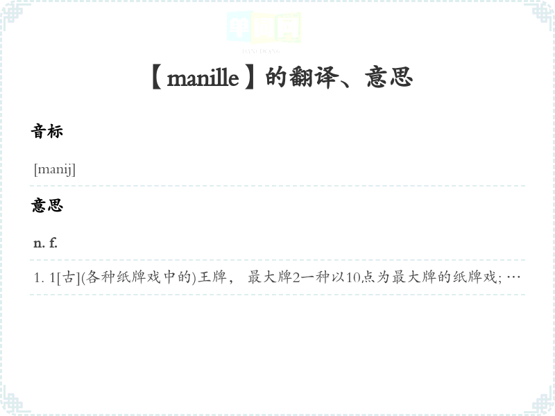 1[古](各种纸牌戏中的)王牌, 最大牌2一种以10点为最大牌的纸牌戏; 这种纸牌戏中的10点n. m雪茄烟; 麻n. f1(旧时套在囚徒脚上连接锁链用的)脚环, 脚镣环2(铁链的)卸扣, 卸克, 钩环