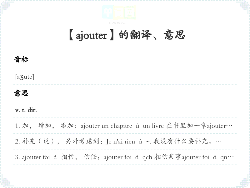 ajouter foi à 相信, 信任:ajouter foi à qch 相信某事ajouter foi à qn 相信某人所说4增进; 改善v. t. indir.增加, 补充:ajouter à ce qui manque 补其不足le mauvais temps ajoute encore aux difficultés de la circulation. 坏天气使得交通更加困难。s'ajouter v. pr.增加, 补充:Les renforts viendront s'ajouter à nos troupes. 我们部队即将得到增。