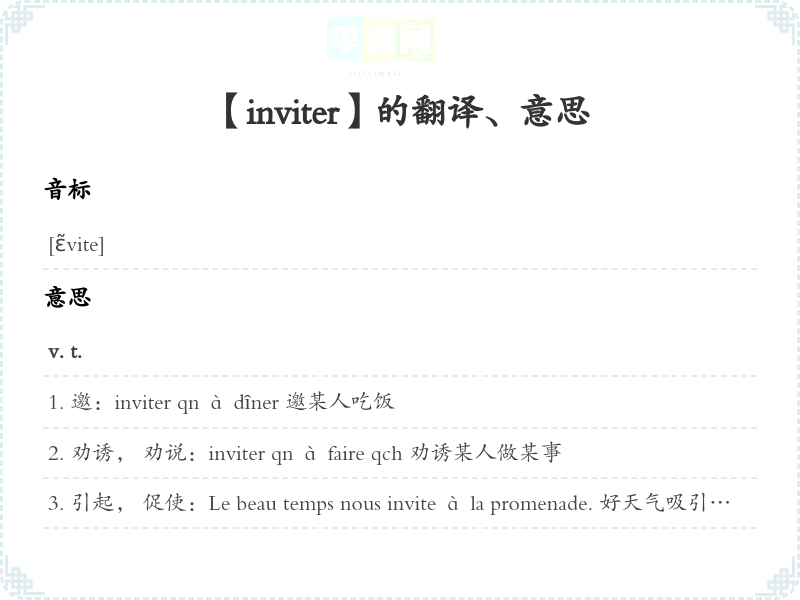 引起, 促使:Le beau temps nous invite à la promenade. 好天气吸引们去散步。