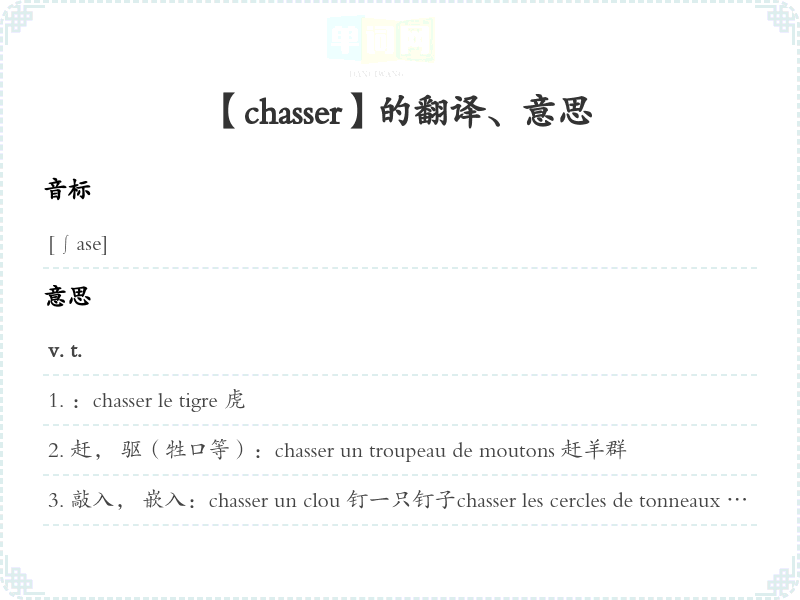 ; 捕捉[指动物]:chasser à course 围chasser sur les terres d'autrui [转]侵犯别人的权益Bon chien chasse de race. [谚]龙生龙, 凤生凤, 老鼠的儿子会洞。