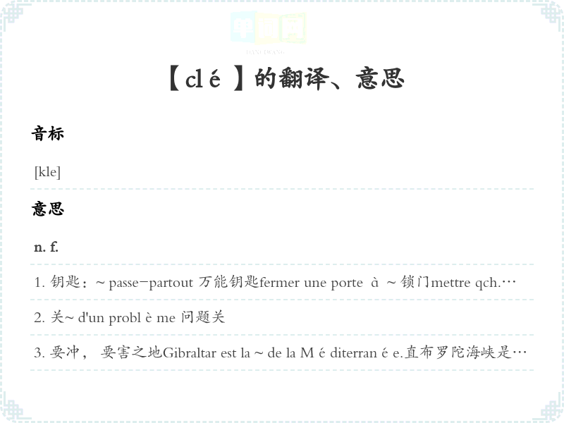 钥匙:~ passe-partout 万能钥匙fermer une porte à ~ 锁门mettre qch. sous ~ 把某物锁起来mettre qn sous ~ 将某人关起来; 将某人投入狱中mettre la ~ sous la porte <转>悄悄地离开, 溜走; 迁居prendre la ~ des champs <转>溜走, 逃之夭夭les ~s de saint Pierre[du Pape] 【宗】罗马教皇权力转>转>