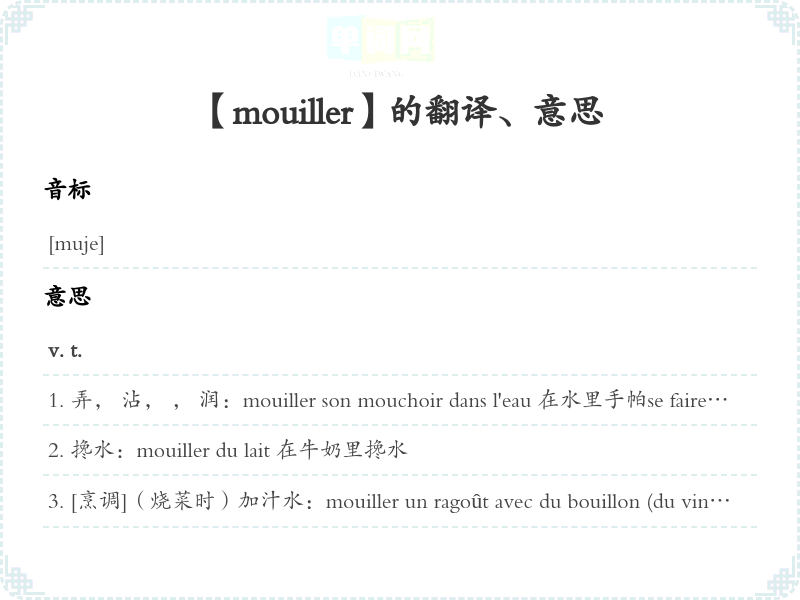 【mouiller】 助记:、 派生:、 :、 近义词:、 反义词: 词