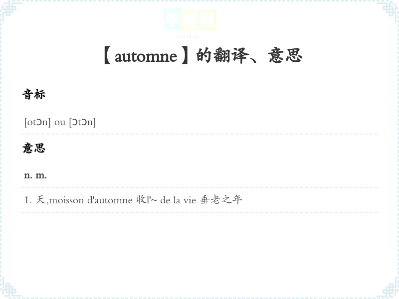【automne】 联想:、 形容词变化:、 近义词:、 反义词: 联想词