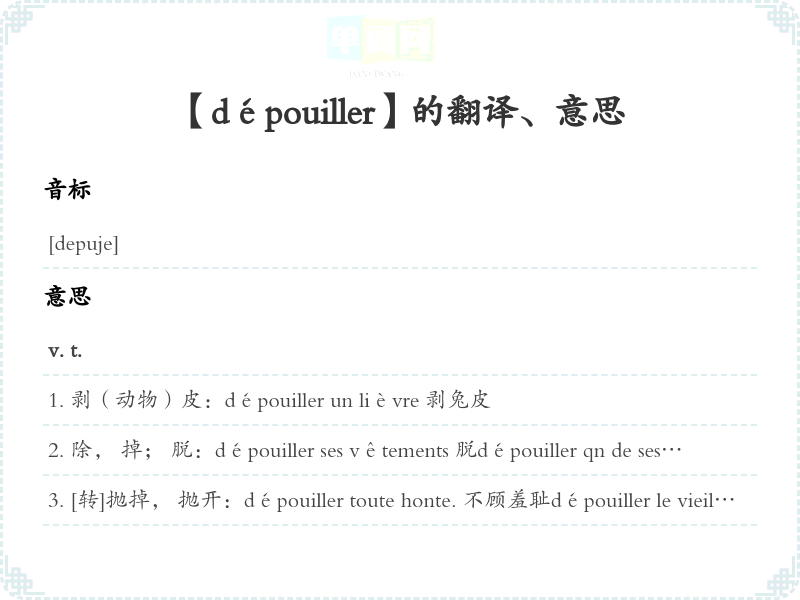 除, 掉; 脱:dépouiller ses vêtements 脱dépouiller qn de ses vêtements 脱某人的dépouiller un arbre de ses branches 掉一棵树的树枝