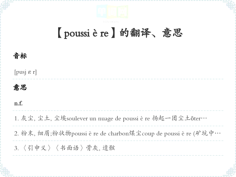 灰尘, 尘土, 尘埃soulever un nuage de poussière 扬起一团尘土ôter [enlever] la poussière 去掉灰尘sac à poussière de l'aspirateur吸尘器蓄尘袋avoir une poussière dans l'œil有一粒灰尘mordre la poussière 被打翻在地;被打死;〈转义〉遭到失败réduire en poussière 使成粉末;〈转义〉粉碎, 毁灭secouer la poussière de ses pieds [de ses sandales]〈转义〉永远离开
