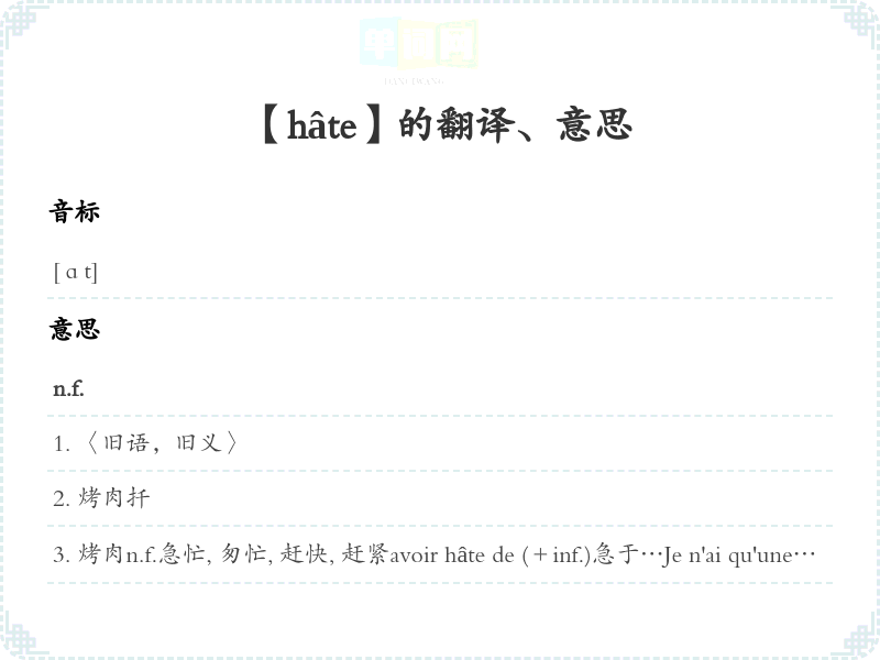 烤肉n.f.急忙, 匆忙, 赶快, 赶紧avoir hâte de (+inf.)急于…Je n'ai qu'une hâte , c'est d'être à samedi.我只有一件事最急, 着星期六快到。sans hâte 从容不迫地, 不慌不忙地à la hâteloc.adv.匆忙地, 急急忙忙地déjeuner à la hâte 急急忙忙地吃午餐en [avec] hâte , en toute hâteloc.adv.赶快, ;急急忙忙地Venez en toute hâte !赶快来呀!On l'envoya en hâte .人派他前往。