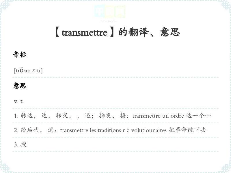 【transmettre】 助记:、 词根:、 近义词:、 反义词: 联想词