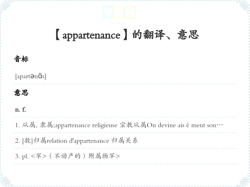 从属, 隶属;appartenance religieuse 宗教从属On devine aisément son appartenance politique. 很容易猜出他在政治上属于哪个党派。