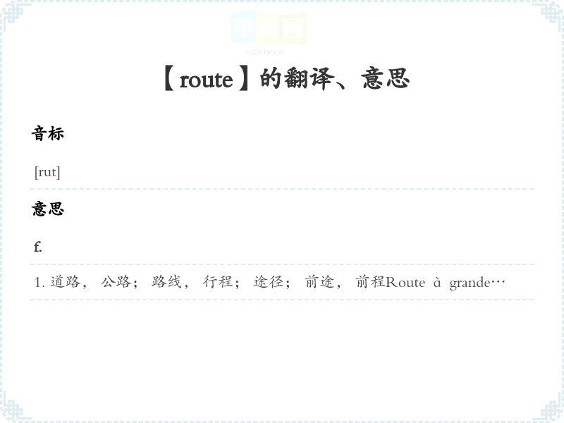 道路, 公路; 路线, 行程; 途径; 前途, 前程Route à grande circulation 交通繁忙的公路Souhaiter bonne route à qn 祝某人一路平安Des obstacles se sont trouvés sur ma route. 在我人生道路上曾出现过困难