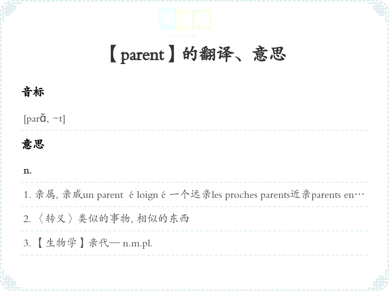 【parent】 联想:、 近义词:、 反义词: 联想词