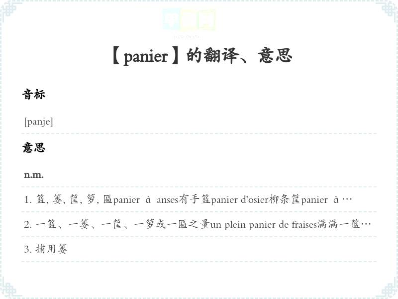 篮, 篓, 筐, 箩, 匾panier à anses有手篮panier d'osier柳条筐panier à provisions食物采购篮panier à ouvrage针线活计篮panier à bouteilles放瓶金属格架panier à salade沥生菜用篓子;〈转义〉〈口语〉囚车panier de crabes〈转义〉〈口语〉一群互相倾轧人le panier de la ménagère(用于消费指数计算)食用开支;〈引申义〉日常开支;(消费者在某一商场)购物量panier de devises [de monnaies]通货单位mettre dans le même panier …混为一谈panier roulant(幼儿学步用)柳制行架panier percé挥霍无度人mettre [jeter] au panier 丢入废纸篓