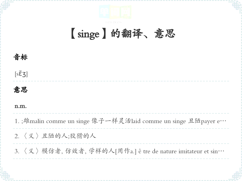 ;雄malin comme un singe 像子一样灵活laid comme un singe 丑陋payer en monnaie de singe 〈义〉用空话敷衍债主;用空话报答On n'apprend pas à un vieux singe à faire la grimace.〈谚语〉用到教老扮鬼脸。 [喻必多此一举]