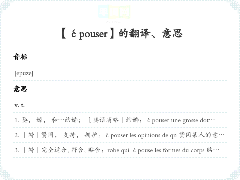 [转]赞同, 支持, 拥护:épouser les opinions de qn 赞同某人的意见épouser le parti de qn 站在某人一边épouser la querelle de qn 站在某人一边帮他争吵