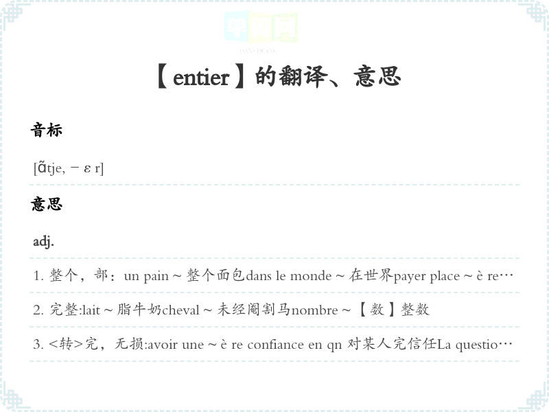 【entier】 词源:、 形容词变化:、 副词变化:、 近义词:、 反义词: 联想词