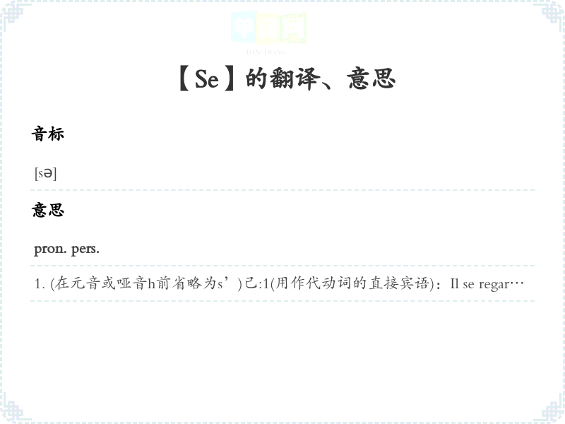 (在元音或哑音h前省略为s’)己:1(用作代动词的直接宾语):Il se regarde dans la glace. 照镜子2(用作代动词的接宾语):Il ne se lest pas fait dire deux fois. 不用人家讲第二遍Ils se nuisent. 们两败。 Ils se sont donné quelques jours pour réfléchir. 们给己几来考虑。3(用来构成纯粹的代动词):Il s'en moque. 毫不在乎, 不放在心上Elle s'en va. 她走了。4(用来构成起被动作用的代动词):Cela ne se dit pas ainsi en français. 在法语里不是这样讲的5(用于无人称代动词中):Il se peut que je vienne. 我可能来. Il s'en faut de beaucoup. 还差很多。 Comment se fait-il que vous vous taisiez?怎么您一言不发啦?6(代替son, sa, ses):Il se lave les pieds. 洗脚(即 Il lave ses pieds. )sexercer la mémoire锻炼记忆力7(特殊用法):Il se meurt. 正在死去。 [与Il meurt. (死了)不同] -- (se 在 faire, envoyer等动词后可省略):envoyer promener qn 把某人撵走