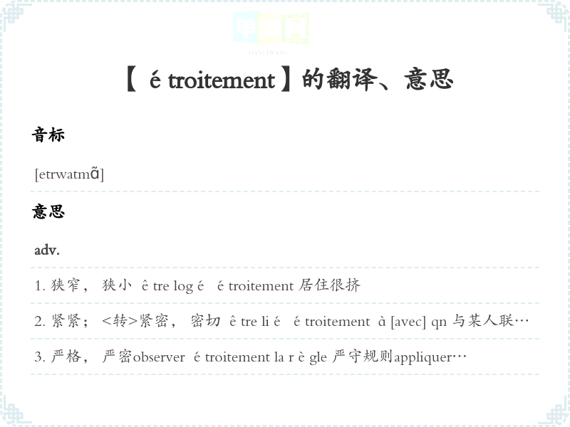 【étroitement】是什么意思、字义解释