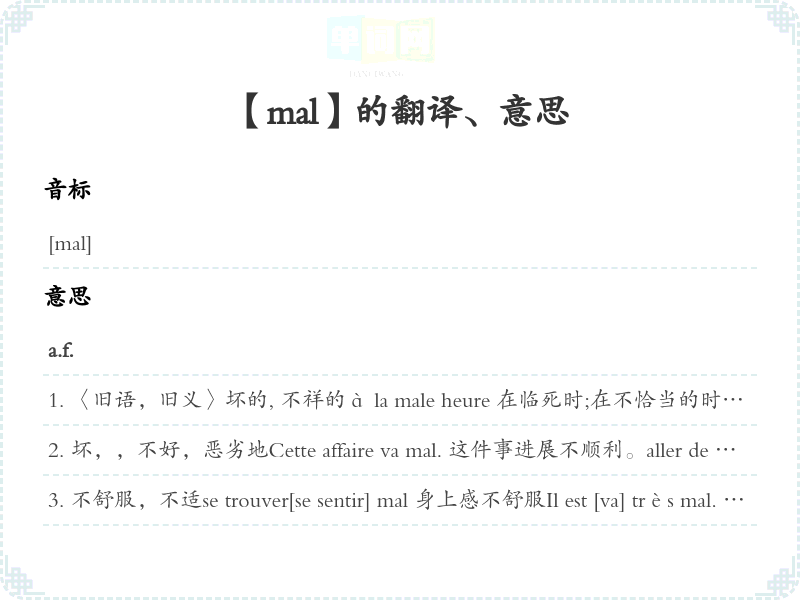 疼痛,不适souffrir d'un mal de dents 牙痛mal des montagnes [de l'altitude] 高山avoir mal au cœur 恶心mal de mer[de l'air,de la route] 晕船/飞机/车faire mal à qn 使某人受伤, 弄痛某人Cela me fait mal de voir [d'entendre] cela.〈转义〉〈口语〉看 [] 这个真使我难受。se faire mal en tombant 摔跤受伤