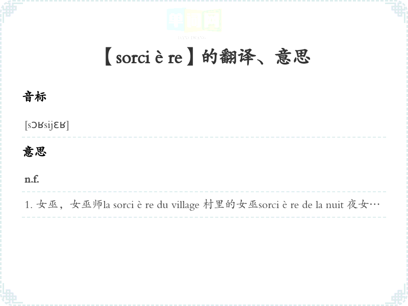 【sorcière】 助记:、 词根:、 联想、 名词化:、 词化:、 形容词化:、 近义词、 反义词、 同音、近音词 联想词