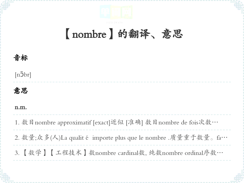 许多, 好多depuis nombre d'années多年来Bon nombre de gens l'ont vu.许多人见到他。au nombre deloc.prép.为数, 总共Ils sont au nombre de trois.他们共三人。du [au] nombre deloc.prép.在其中, 在…之列J'ai vu la liste des délégués, il n'est pas du nombre .我看过代表名单, 他不在内。Il est du nombre des élus.他是当选者之一。dans le nombreloc.adv.其中J'ai vu des élèves;dans le nombre , se trouvaient beaucoup de filles.我看见了一些学生, 其中有不少女学生。en nombreloc.adv.大量, 众多Nous étions venus en nombre à cette réunion.我们很多人来参加这次会议。sans nombreloc.adv.数, 不可胜数Cet événement a eu des témoins sans nombre .数人目睹了这事件。