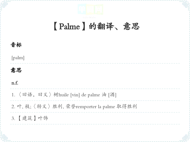 叶, 枝;〈转义〉胜利, 荣誉remporter la palme 取得胜利