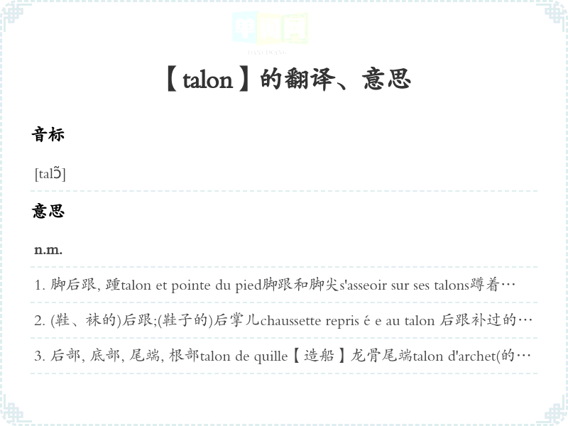 (鞋、袜的)后跟;(鞋子的)后掌儿chaussette reprisée au talon 后跟补过的短统袜talons plats [hauts]平 [] 跟talons aiguilles细跟talon rouge红跟 [17世纪法国对穿红后跟鞋的贵族的称呼]; 〈转义〉〈书面语〉风雅的人faire remettre des talons à ses chaussures把鞋子送去钉后掌儿