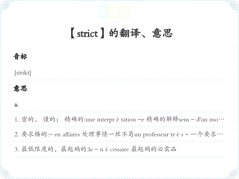 要求格的:~ en affaires 处理事情一丝不苟un professeur très ~ 一个要求格的教师être ~ envers soi 格要求自己Il est très ~ sur la discipline. 他在纪律上格的。