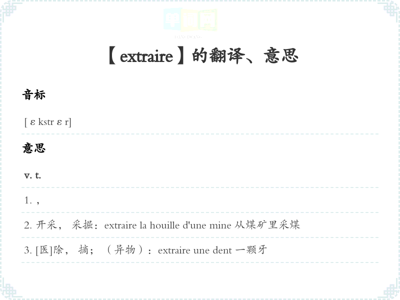 【extraire】 助记:、 派生:、 义词:、 反义词: 联想词