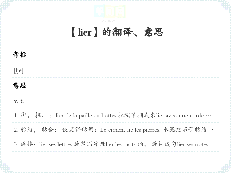 连接:lier ses lettres 连笔写字母lier les mots 诵; 连词成句lier ses notes [乐]圆滑地演奏或演唱lier les pensées 使思想贯起来